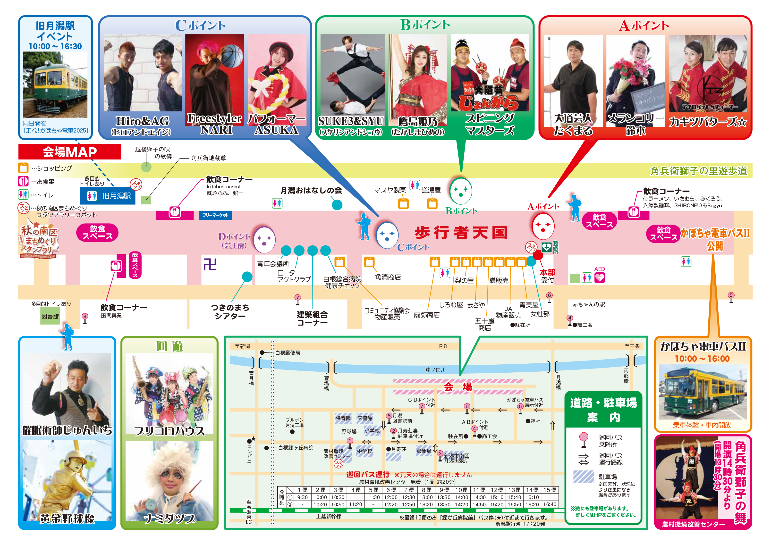 メイン会場の主要ポイント、駐車場、巡回バスの情報などがご覧いただけます。その他の情報は表示を切り替えてご覧ください。[外部サイト]